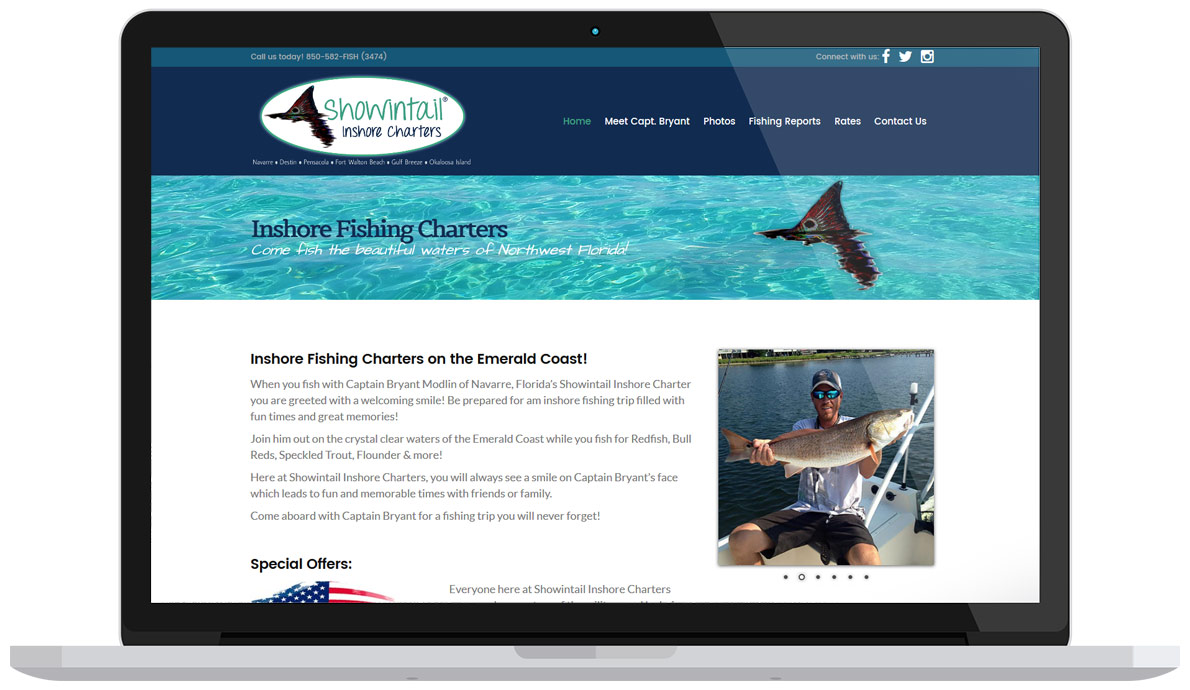 Showintail Inshore Fishing Charters contacted Pensacola Web Designs because their website was not even listed in the search engines and they wanted a new look and a mobile friendly design. We designed a logo using their fish tail icon and created a beautiful, functional website...